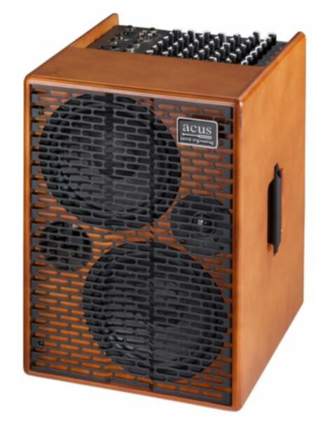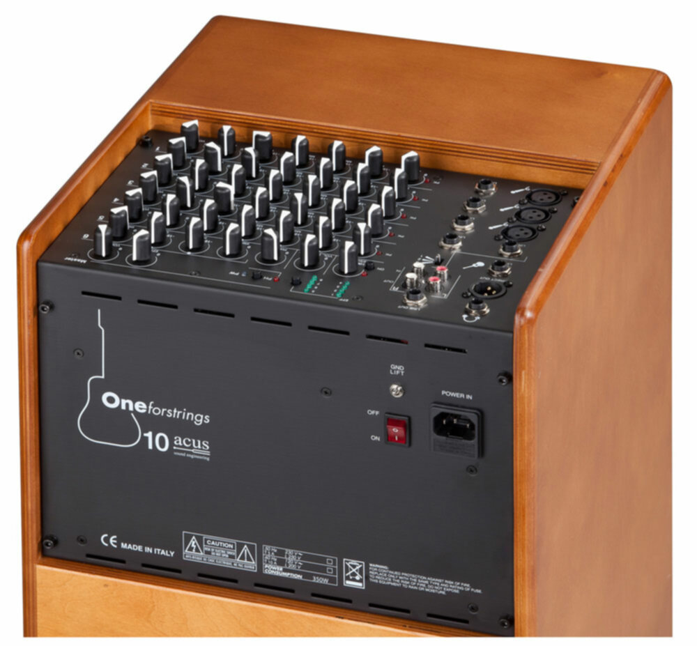 ONE FOR STRINGS 10 AD WOOD Ampli acoustique, 350W, 2 voies bi-amplifiée, 3 entrées Jack/XLR, 1 entrée ligne L/R, 1 entrée jack pour instrument à cordes (pre-réglage 3 positions), RCA In et out, EQ 4 bandes,Line et direct OUT,8 effets,fonction anti-résonance commutable,2X HP8",1 tweeter, finition bois