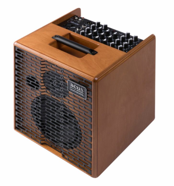 ONE FOR STRINGS 6T WOOD Ampli acoustique 100W, 2 voies bi-amplifiées, 1 entrée XLR symétrique, 2 entrées ligne, EQ 3 bandes, reverb, entrée et sortie RCA stéréo, Direct Out, Alim. fantôme commutable, 1X HP6", 1 tweeter, finition bois