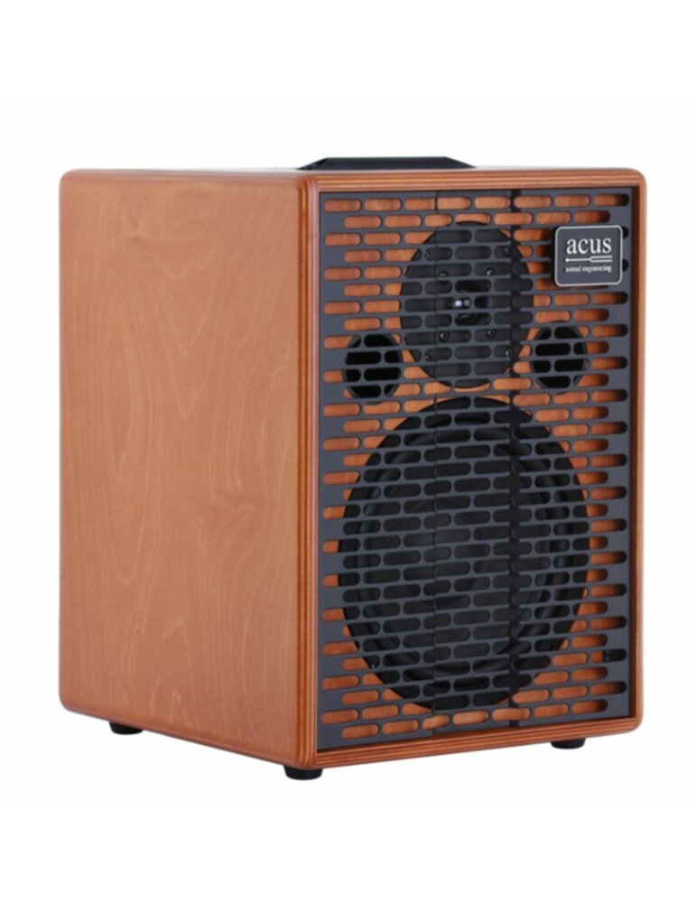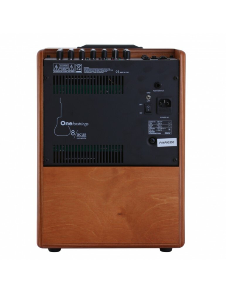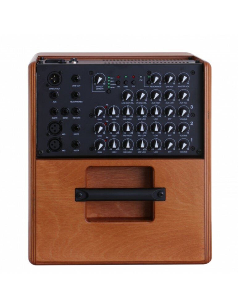 Combo pour instruments acoustiques et voix Puissance: 200 Watt 1 haut-parleur 8" 1 moteur d'aigus Bass-Reflex avec 2 ouvertures 4 canaux: 2 x micro, 1 x instrument,1 x Aux EQ 4 bandes: Low, Mid-Low, Mid-High, High Contrôle Gain par canal Contrôle du volume général Effets réglables en longueur: Rev1, Rev2, Chorus, Delay Effect Send/Return pour appareils externes Tension 9 Volt commutable sur le canal 3 Effet commutable via footswitch Entrée Aux avec contrôles de volume et tonalité (High, Low) Filtre Notch Sortie DI sur XLR Sorties ligne sur Jack ou RCA Sortie casque Interrupteur de masse Boîtier en contreplaqué Embase 36 mm pour montage sur pied Couleur: Bois naturel