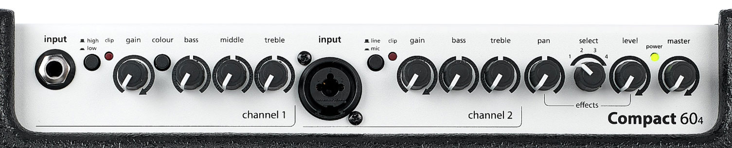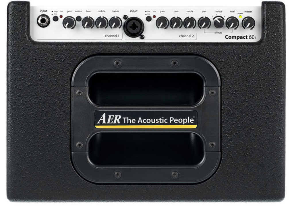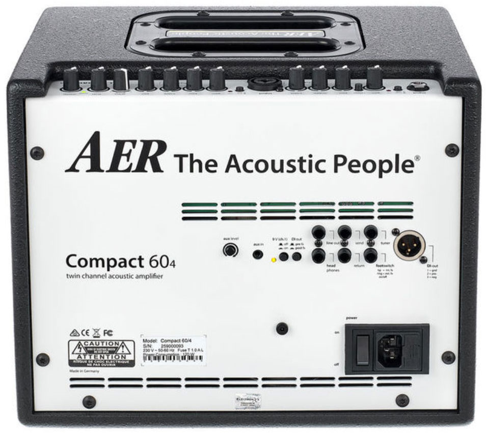 Adoubé par des guitaristes acoustiques aussi prestigieux tels que Tommy Emmanuel, John Renbourn ou Bireli Lagrene, le combo pour guitare électro-acoustique AER Compact 60/4 (60 watts, 1x8, 2x canaux, effets) est aussi pratique, compact que fonctionnel. Doté de deux canaux, de réglages subtils et d'un processeur d'effet digital pourvu de quatre presets (deux reverb, delay, chorus), il surprend par le volume et le rendement qu'il génère. Il reste toujours parfaitement musical, et sa transparence respectera l'intégrité sonore de votre instrument. L'AER Compact 60/4 est aussi redoutable avec les guitares folks (cordes bronze/acier) qu'avec les classiques (cordes nylon), les ukulélés ou les mandolines. - 60 Watts RMS sous 4 ohms - 1x haut-parleur 8" twin cone - 2x canaux - Réglages canal 1 : entrée jack 1/4, sélecteur Hi/Lo, Gain, Switch Color, Bass, Mid, Treble - Réglages canal 2 : entrée XLR, Switch Line/Micro, Gain, Bass, Treble - Section Master : Effect Pan, sélecteur effets (2 Reverbs/Chorus Reverb/Flange ), Master - Prise casque - Sortie accordeur - Line Out - DI Out XLR - Boucle d'effet - Possibilité de fixation sur un pied micro - 325 x 235 x 260 mm - 6.5 kg - Housse incluse - Footswitch optionnel
