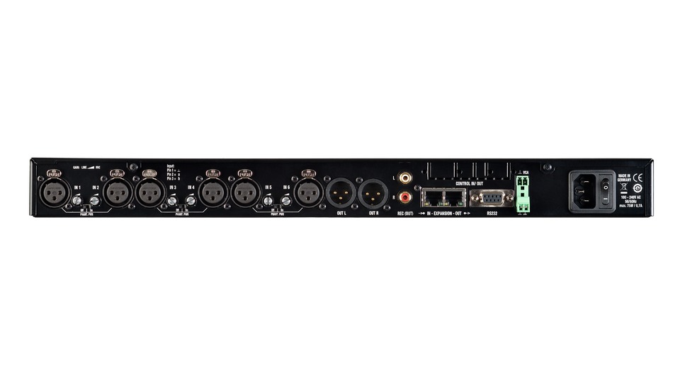 Les entrées peuvent être individuellement dirigées vers la sortie stéréo générale ou vers la sortie enregistrement. Une interface RS232 permet le contrôle externe par des systèmes de type AMX ou Crestron.