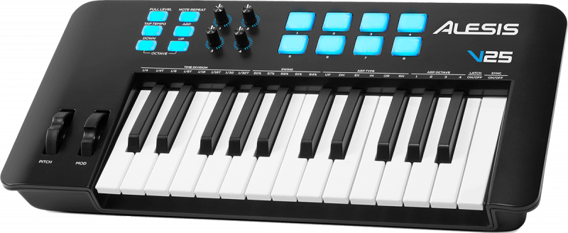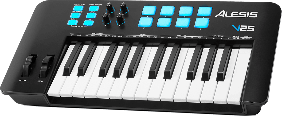 Cette seconde version du célèbre clavier Alesis V25 a été développée dans l'idée d'offrir une plateforme de production idéale pour tous les home-studistes grâce à son interface épurée mais efficace. Ce V25 MkII met à disposition 25 notes sensibles à la vélocité associées à des boutons de changement d'octave. Pour donner toujours plus d'expressivité au jeu, le V25 est équipé d'une molette de pitch et de modulation, ainsi que de 4 potentiomètres assignables en MIDI.