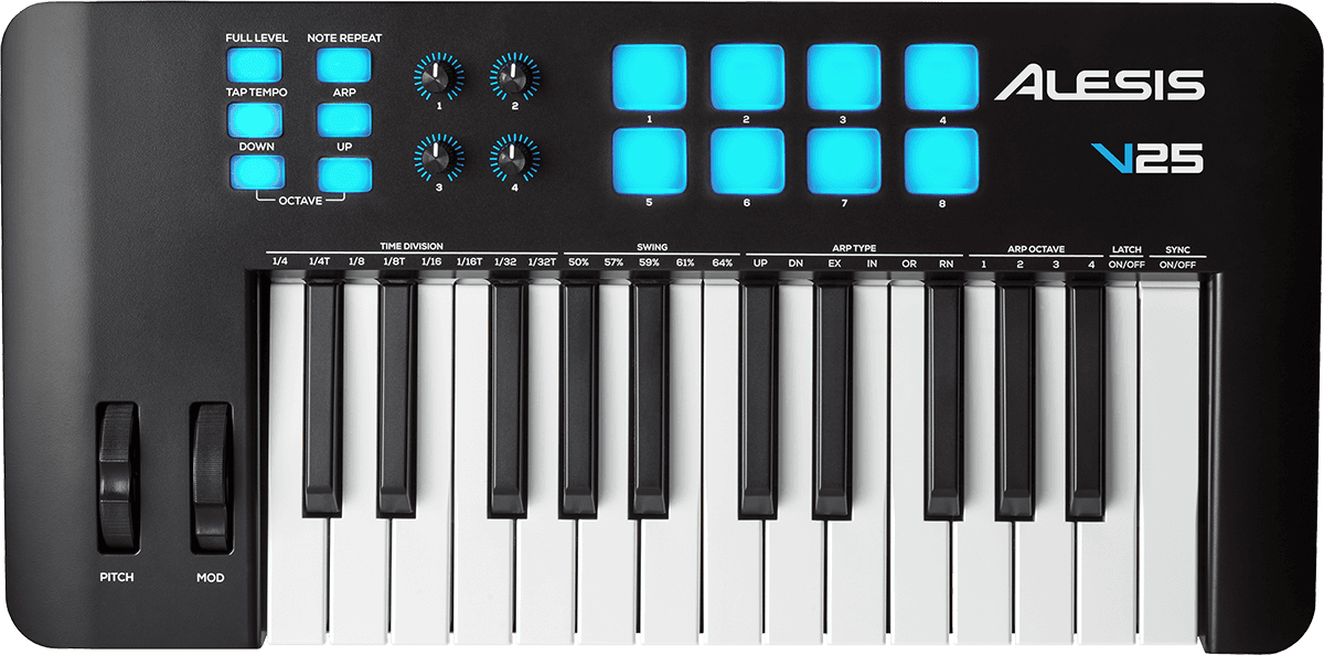 Le V25 MkII a été pensé comme une solution idéale réaliser des productions de bout en bout grâce aux fonctionnalités intégrées. Ce clavier maître intègre des pads de performance rétroéclairés, associés aux modes Full Level et Note Repeat pour produire des rythmes en toute simplicité. Pour simplifier toutes compositions, le V25 MkII dispose également d'un arpégiateur polyvalent avec 6 modes différents, associé à des commandes de tap tempo, de division du temps, de gate et de swing.