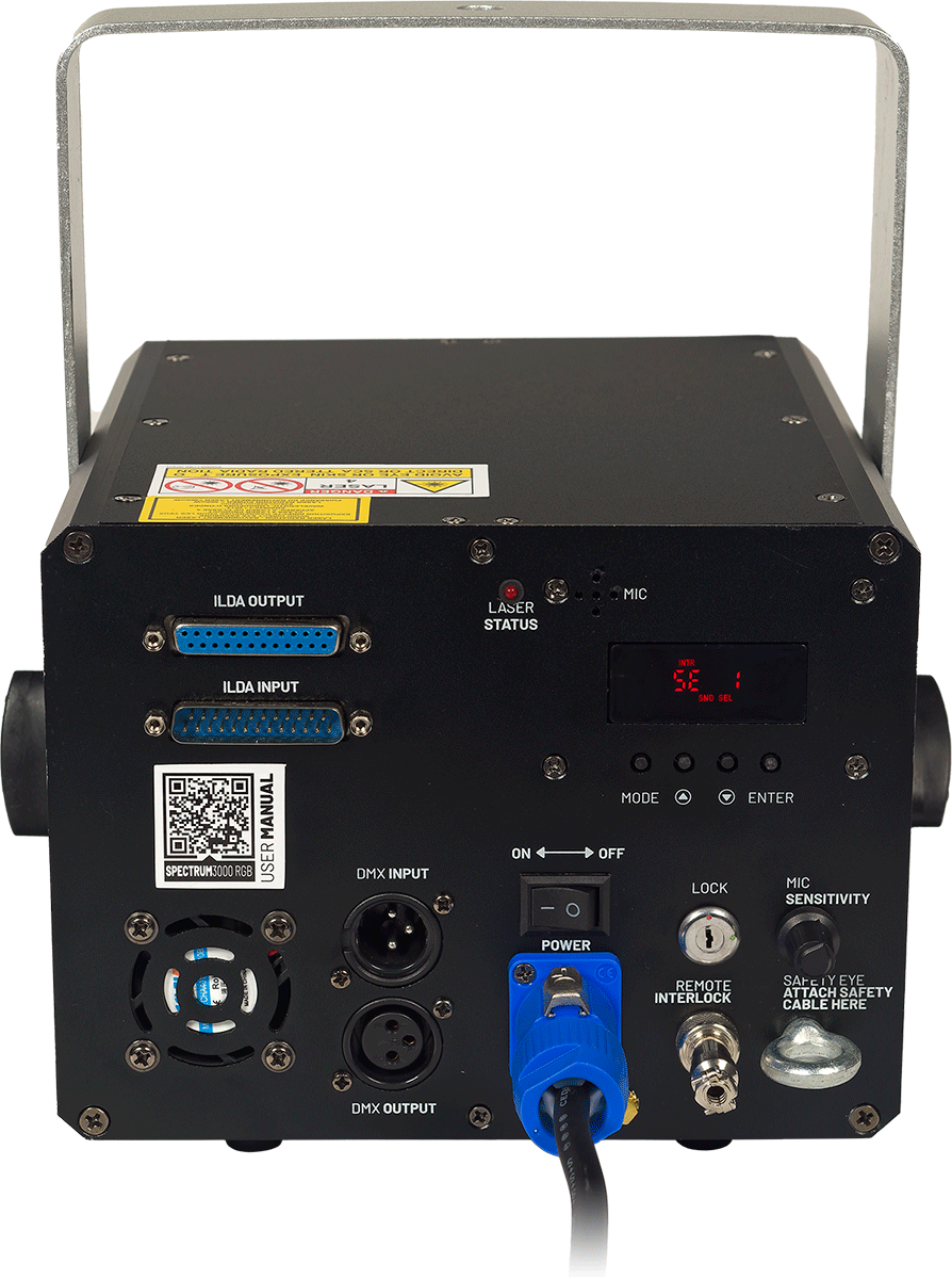 Conçu pour les professionnels du spectacle, le SPECTRUM 3000 RGB présente bien évidemment une interface DMX à 34 canaux, commutable en 6 canaux afin d'économiser de l'espace dans vos univers DMX si besoin. Ce laser embarque aussi une interface de programmation avancée ILDA, vous permettant de piloter précisément le laser via un logiciel dédié et de créer vos propres motifs personnalisés pour vos spectacles et évènements. En tant que dispositif professionnel, le SPECTRUM dispose d'un dispositif d'arrêt d'urgence via le connecteur d'interlock et une clé de protection afin d'éviter toute utilisation non autorisée, conformément à la norme 60825-1:2014.