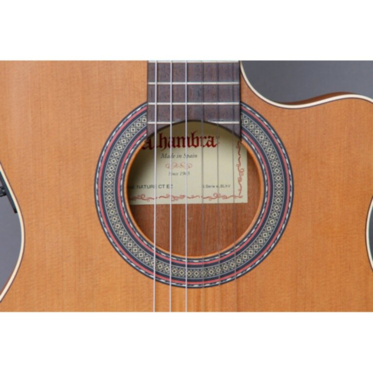 ALHAMBRA Z NATURE CT EZ GUITARE CLASSIQUE ELECTRO CORPS FIN La guitare Alhambra Z Nature CT EZ est une guitare électro-acoustique classique avec pan coupé et caisse étroite. Les étapes de fabrication ont été réduites en corrélation avec son coût total de production, cela malgré le maintien de la qualité reconnue des guitares de la marque Alhambra. La Alhambra Z Nature CTEZ est fabriquée en Espagne avec des technologies innovantes qui améliorent la qualité du son. Elle possède un volume exceptionnel et une très bonne projection. Cette guitare a bénéficié de l’expérience des luthiers de la marque Alhambra. Avec sa finition naturelle satinée, les pores de la guitareZ Nature CTEZ restent ouverts ce qui permet au son d’être d’offrir une grande résonnance. Les guitares Alhambra Z Nature sont d’un design simple qui met en valeur leur beauté naturelle. Cette guitare offre aux débutants une réelle opportunité de commencer à apprendre à jouer dans de bonnes conditions et avec un instrument de très bon rapport qualité-prix. Cette guitare est équipée du système d’amplification Fishman Classique II avec accordeur. Housse de guitare Alhambra inclus. Fiche technique: Table // Qualité: Cèdre massif (Thuja Plicata) // A Fond et éclisses: Sapelli (Entandrophragma Cylindricum) Manche: Acajou d'Afrique (Khaya Ivorensis) Touche: Palissandre d'Inde (Dalbergia Latifolia) Mécaniques d'accordage: Nickelées Finition: Pores ouverts Sillets de tête et chevalet: Melamine Cordes: D'Addario EXP44 Extra High Tension Relieure en sycomore sur la table Préampli: Fishman Classic II