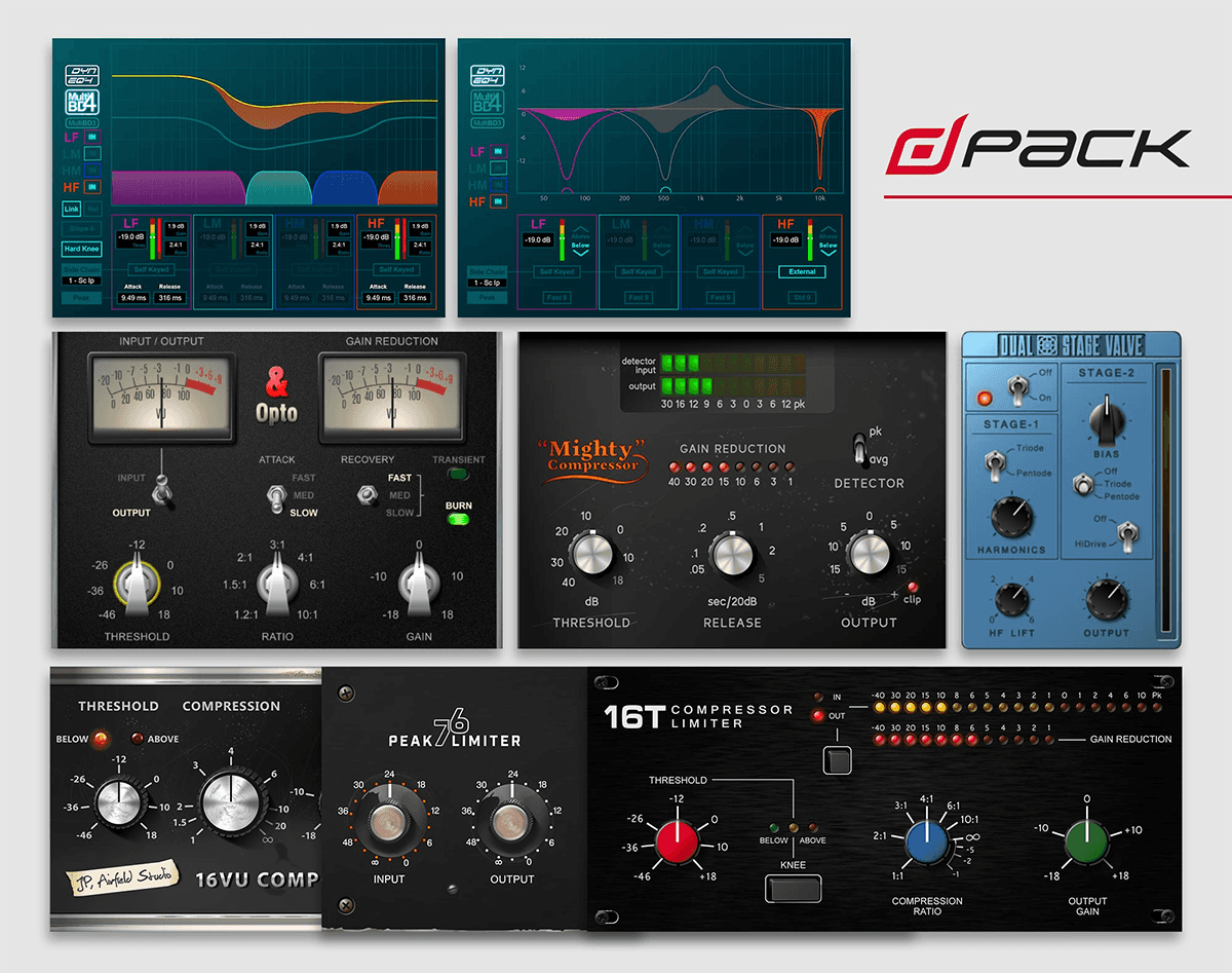 - Le bundle de plugins optionnel dPack procure une partie du processing de la dLive : 16 processeurs de dynamique Dyn8, bibliothèque de compresseurs DEEP par voie sans latence et émulations de préamplis à lampe Dual-Stage Valve
