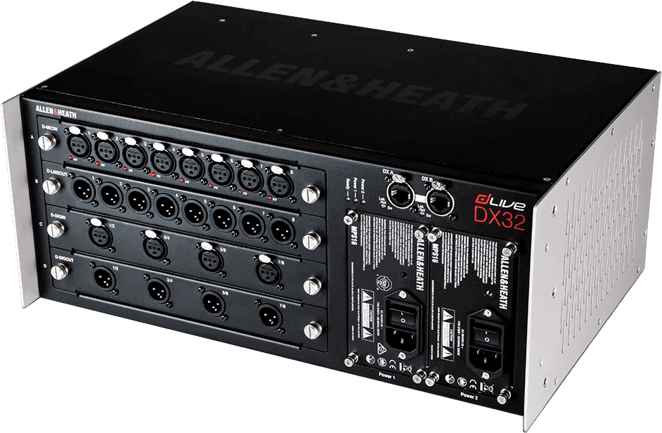 Le module DX32 est un système d'entrées/sorties modulaire déporté pour les systèmes dLive Classe S et Classe C. Il offre 4 slots de 8 canaux pour s'ajuster à vos besoins en proposant une sélection de cartes d'entrées/sorties analogiques et numériques. Il est possible de connecter jusqu'à 2 modules DX32 à un MixRack, tandis qu'un troisième DX32 peut être connecté à une Surface.