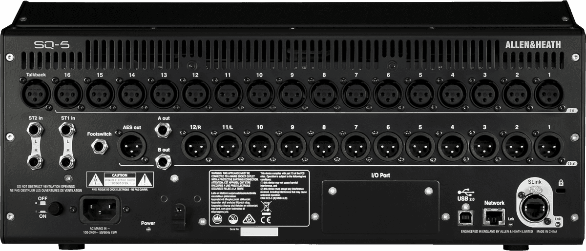 Dotée d'un port I/O capable d'accueillir des cartes DANTE ou WAVES et inter-compatible avec les systèmes dLive, la SQ hérite les célèbres plugins DEEP de la dLive, la librairie d'effets RackExtra et 8 moteurs d'effets stéréo stéréo avec retours dédiés.