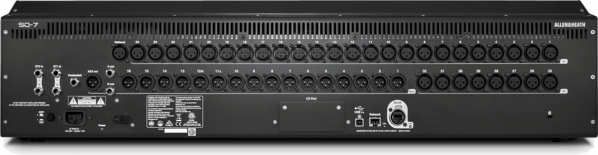 Dotée d'un port I/O capable d'accueillir des cartes DANTE ou WAVES et inter-compatible avec les systèmes dLive, la SQ hérite les célèbres plugins DEEP de la dLive, la librairie d'effets RackExtra et 8 moteurs d'effets stéréo stéréo avec retours dédiés.