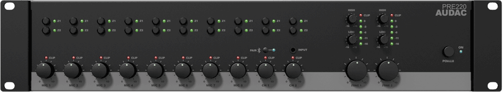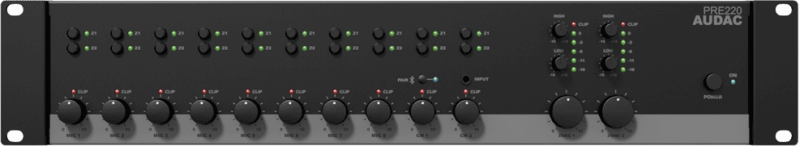 Le PRE220 est un préamplificateur stéréo deux zones avec 8 entrées micro, 2 entrées ligne stéréo, et toutes les possibilités de contrôle et de connexion nécessaires. Les fonctions de commande sont situées à l'avant. Chaque canal dispose d’un contrôle de volume, d’un indicateur LED clip et deux boutons poussoirs et indicateurs LED pour contrôler l'acheminement du signal. La section de sortie de chaque zone est équipée d'un indicateur de niveau LED clip, d’un contrôle de volume principal et d’un contrôle de tonalité deux bandes.