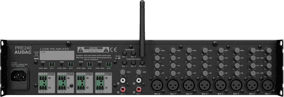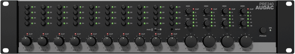 Le PRE240 est un préamplificateur stéréo quatre zones avec 8 entrées micro, 2 entrées ligne stéréo, et toutes les possibilités de contrôle et de connexion nécessaires. Les fonctions de commande sont situées à l'avant. Chaque canal dispose d’un contrôle de volume, d’un indicateur LED clip et deux boutons poussoirs et indicateurs LED pour contrôler l'acheminement du signal. La section de sortie de chaque zone est équipée d'un indicateur de niveau LED clip, d’un contrôle de volume principal et d’un contrôle de tonalité deux bandes.