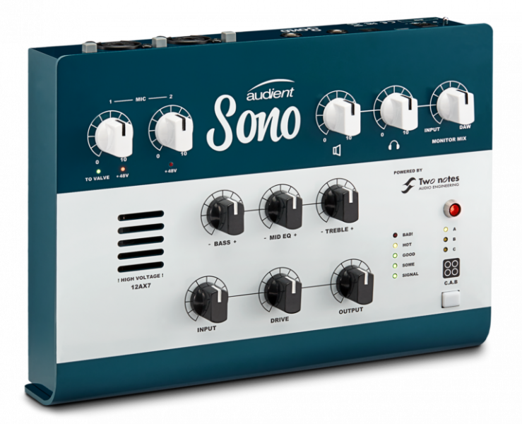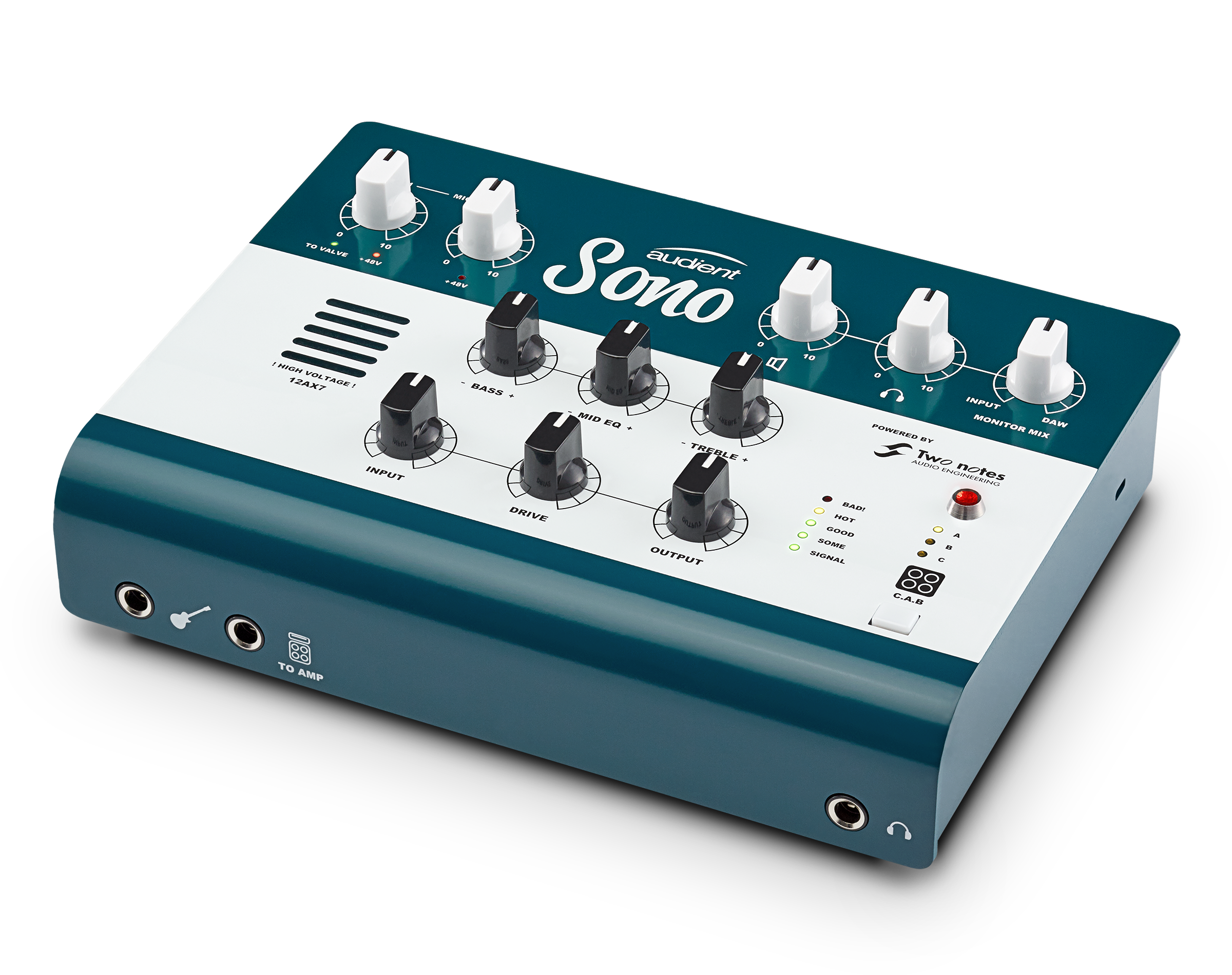 La Sono d'Audient est faite sur mesure pour le guitariste qui enregistre, mariant un préampli alimenté d'une lampe 12AX7 avec un ampli de puissance haut de gamme et des modélisations de Two Notes, ainsi qu'un égaliseur 3 bandes et de puissantes capacités de Re-amp.