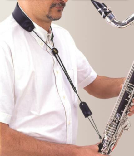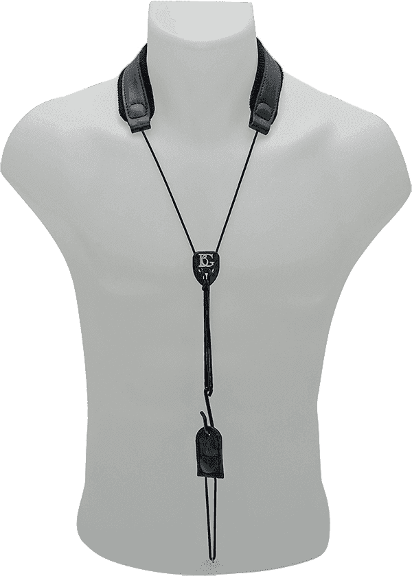Un cordon tour de cou cuir doublé éponge avec ficelle rigide et crochet métal, livré avec une rallonge cuir pour s'adapter à tout système d'attache