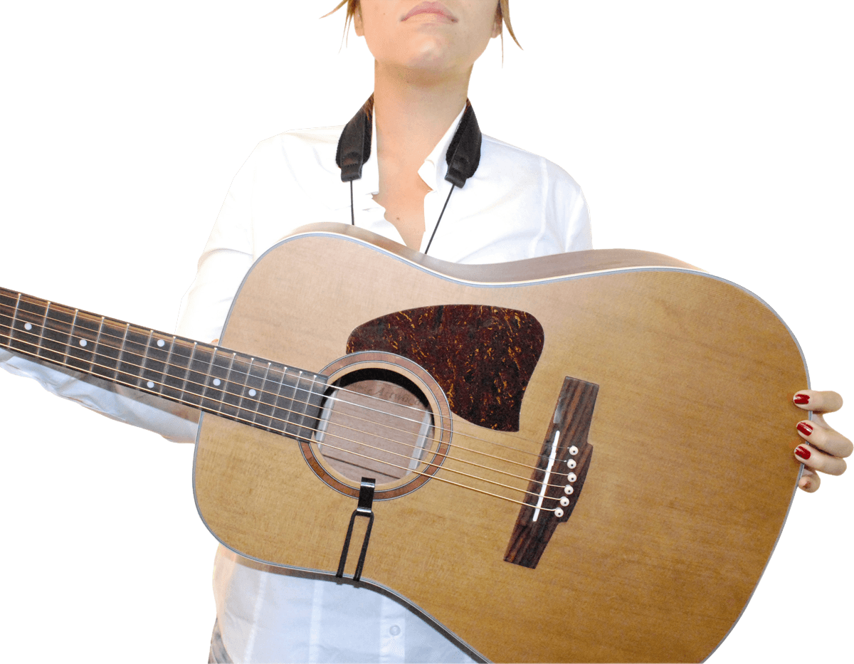 Cordon tour de cou doublé éponge, avec sangle réglable et crochet plastique se fixant sur la rosace de la guitare