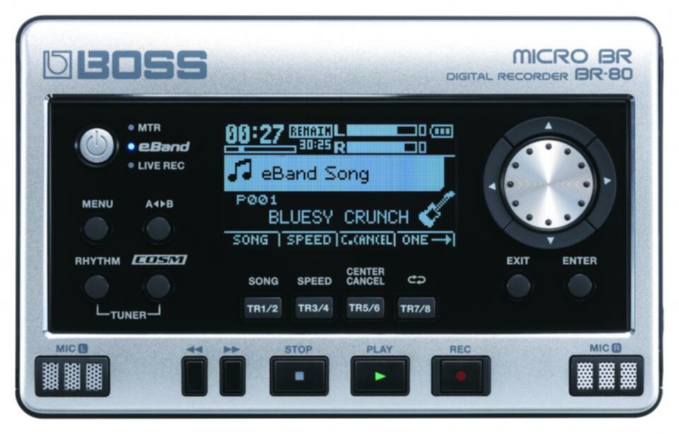 Le mode «eBand» du BR-80 permet aux musiciens d’accompagner leurs morceaux favoris. Avec le logiciel fourni «eBand Song List Editor», vous pouvez importer via USB des fichiers audio de CD, MP3 et WAV de votre ordinateur. La fonction «Center Cancel» permet de minimiser le volume du chant ou du solo pour prendre la place de l’artiste. Le mode «eBand» est aussi un excellent coach: il vous permet d’enregistrer votre partie ainsi que de régler la vitesse et/ou la hauteur de la reproduction des données audio.