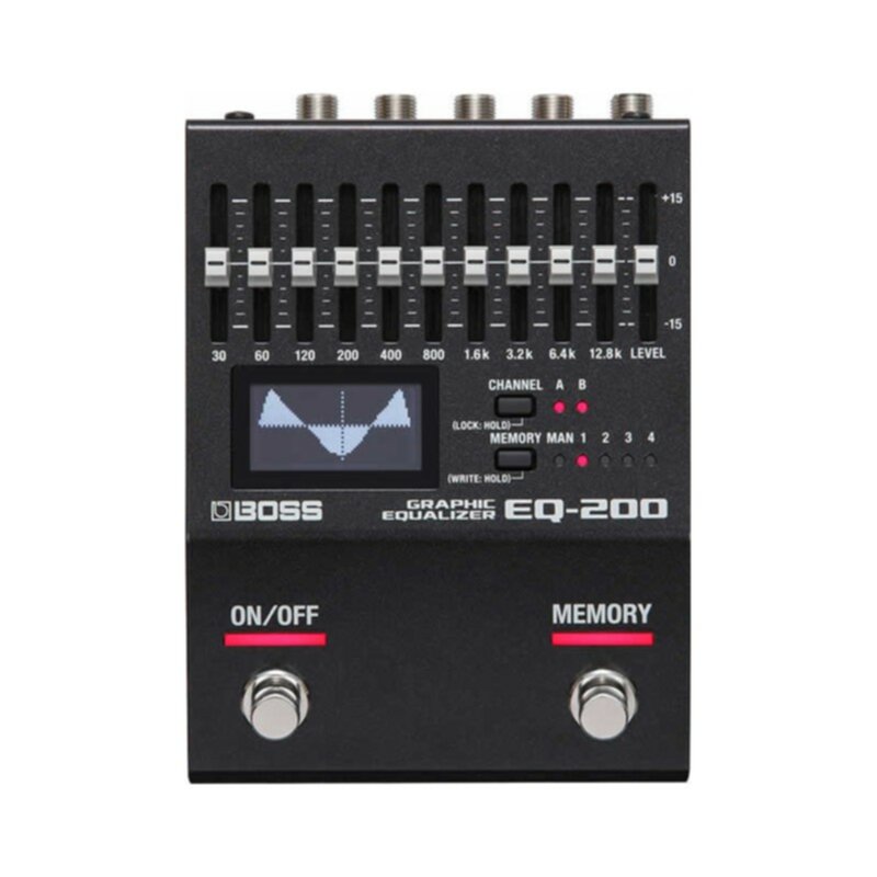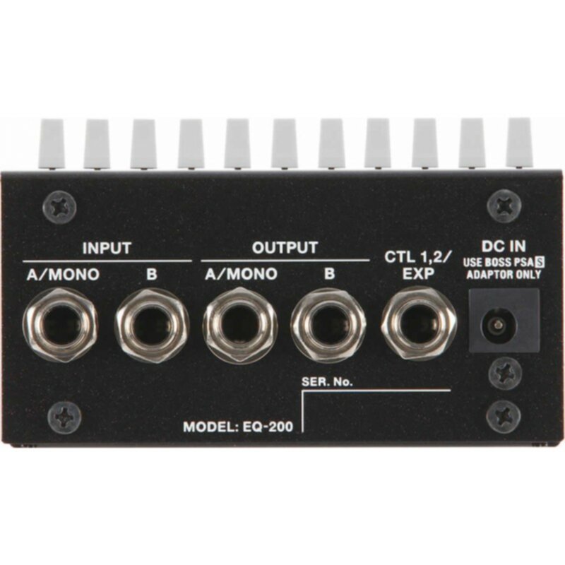 Commandes : 10 faders 30 Hz - 12,8 kHz, niveau, canal, mémoire, 2 interrupteurs au pied, 2x entrées jack (A/Mono, B) 2x sorties jack (A/Mono, B), interrupteurs externes ou prise pour pédale d'expression