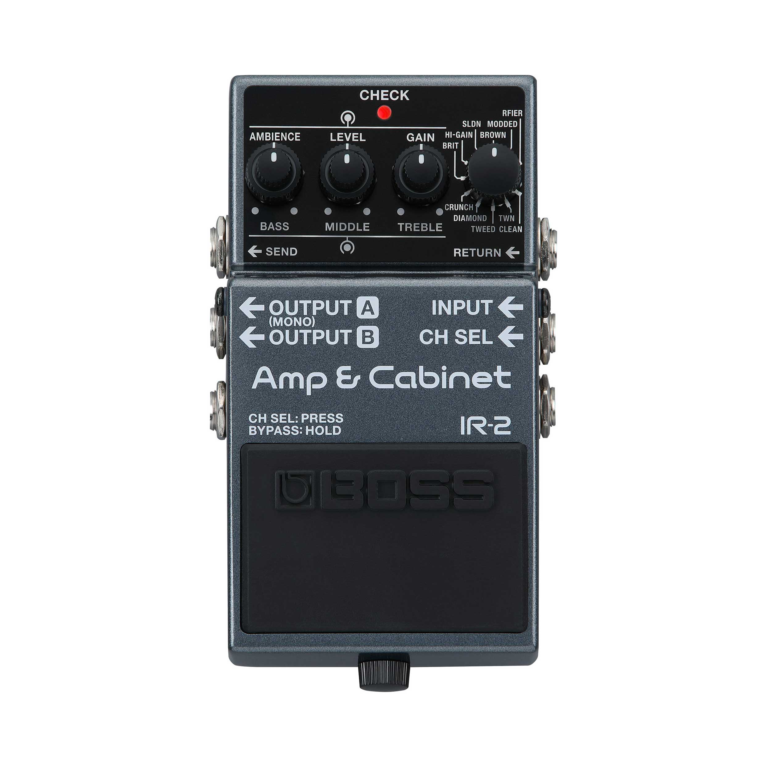 Grâce à l'interface intuitive de l'IR-2, vous êtes immédiatement prêt à jouer. Choisissez le type d'ampli et réglez le son à l'aide des boutons d'ampli classiques. Puis tournez le bouton AMBIENCE pour ajouter du volume et de la profondeur si nécessaire. Vous pouvez brancher vos pédales habituelles dans l'entrée de l'IR-2, comme s'il s'agissait d'un ampli standard. Pour aller plus loin, utilisez la boucle Send/Return et patchez des effets de modulation, delay et reverb dans la chaîne après les sons d'ampli. La prise jack Return peut fonctionner en stéréo pour transmettre le son d'effets stéréo aux sorties de l'IR-2.