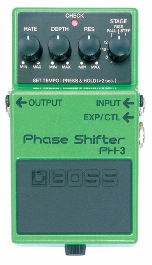 Phase Shifter Phaser classique de BOSS dont des effets à 4, 8, 10 et 12 étages, plus de nouveaux effets "Rise" et "Fall" pour des effets unidirectionnels.