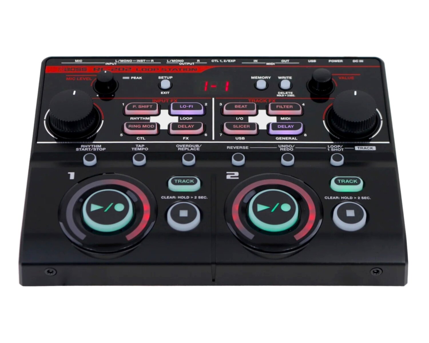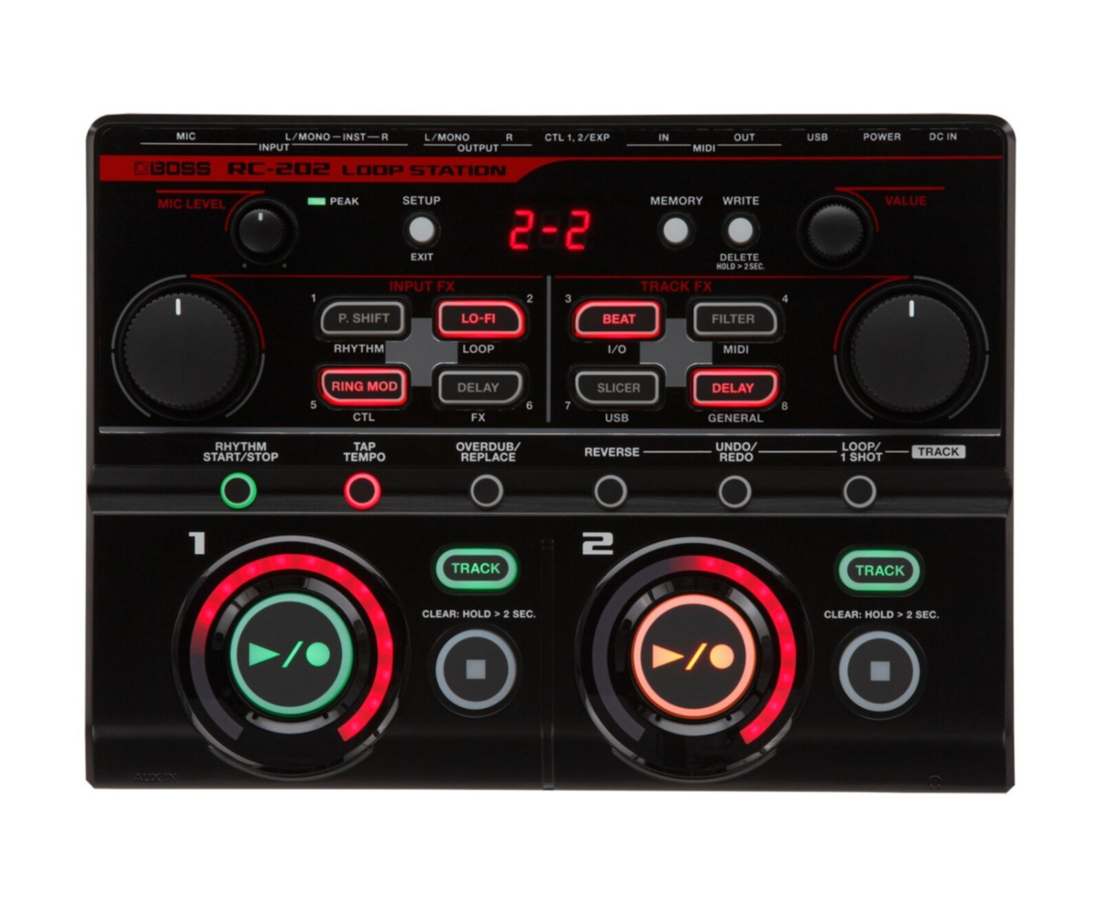 La technologie avancée de BOSS dans un looper compact à poser sur une table, manipulable à la main Deux pistes de loops stéréo simultanées avec contrôleurs dédiés et indicateurs du statut des loops Quatre effets d'entrées et quatre effets de piste disponibles simultanément pour traiter les loops avec des effets de type DJ ou échantillonneur Mémoire de 64 phrases (8 emplacements mémoire dans 8 banques) contenant chacune les deux pistes de loops, les effets appliqués, les réglages de playback, et bien plus Contrôles à distance possibles grâce aux divers footswitches et pédales d'expression en option, et via MIDI Entrée micro XLR avec alimentation fantôme, entrées pour instruments mono ou stéréo, entrée stéréo auxiliaire 17 patterns rythmiques intégrés, incluant des mesures asymétriques Un port USB pour l'importation ou l'exportation de loops, et la connexion à un ordinateur au sein d'un home-studio DES LOOPS AU BOUT DES DOIGTS POUR LES CRÉATEURS DE MUSIQUE ÉVOLUTIVE Idéal pour se produire en club, pour les musiciens électroniques et les Beatboxers, la RC-202 propose toute la puissance des loops et des multi-effets BOSS dans une machine étonnamment compacte à poser sur une table. Basée sur la très populaire Loop Station RC-505, la RC-202 propose, avec ses deux pistes, la même interface et le même look que sa grande s�"ur, ainsi que de toutes nouvelles caractéristiques. Quatre effets d'entrées et quatre effets de piste sont disponibles simultanément, et les loops peuvent être sauvegardées et rappelées en temps réel pour une plus grande souplesse d'utilisation. Des contrôleurs au pied supplémentaires et des options MIDI sont également inclus, pour les musiciens qui ont les mains occupées sur une guitare, des claviers ou autres instruments. - Idéal pour par exemple DJs, Beatboxers et chanteurs - Contrôle à la main - 2 pistes stéréo avec contrôles séparés - 4 entrées et effets Track - 64 mémoires de phrase avec chacune 2 pistes de phrase incluant effet, paramètres de lecture, etc. - Temps d'enregistrement : 3 heures environ - Format des données : WAV (44.1 kHz, 16 Bits, stéréo) - Effets intégrés - Rythmes : 17 - Ecran LED - Fonctionnalité USB audio/MIDI pour utilisation avec logiciel DAW - Entrée microphone sur XLR avec alimentation fantôme 48 V - Consommation : 400 mA - Inclus : Alimentation secteur, Mode d'emploi - Dimensions : 239 x 175 x 55 mm - Poids : 0.95 kg