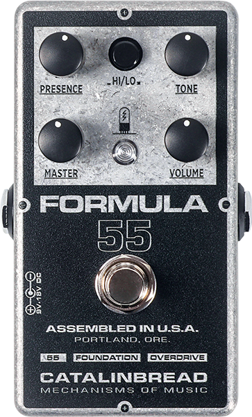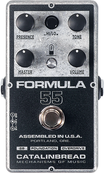Pédale d'overdrive inspirée du Tweed Deluxe 5E3 avec une grande amplitude, de Grant Green à Crazy Horse ! Grosse et puissante, et pourtant raffinée, la Formula n°55 se fond à votre ampli, le transformant en tweed monstre ! Elle reproduit exactement la section de préampli du Fender Tweed 5E3 Deluxe en utilisant un chemin de signal à base de JFET discret. Les réglages Volume et Tone reproduisent pièce par pièce le circuit du 5E3 pour vous donner une réponse d'ampli Tweed authentique. La section de sortie est conçue pour vous donner du punch et du volume avec une faible impédance de sortie pour bien attaquer votre ampli. Mettez le sélecteur sur la positon Lo pour la réponse plus clair d'un ampli Tweed. La position Hi fait comme si vous changiez les lampes de votre ampli pour des lampes à gain plus élevé.