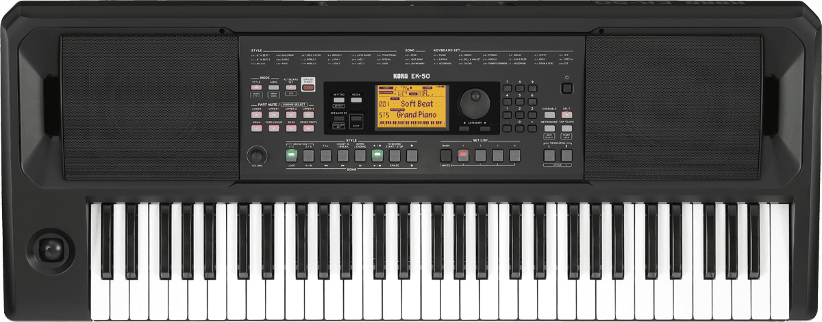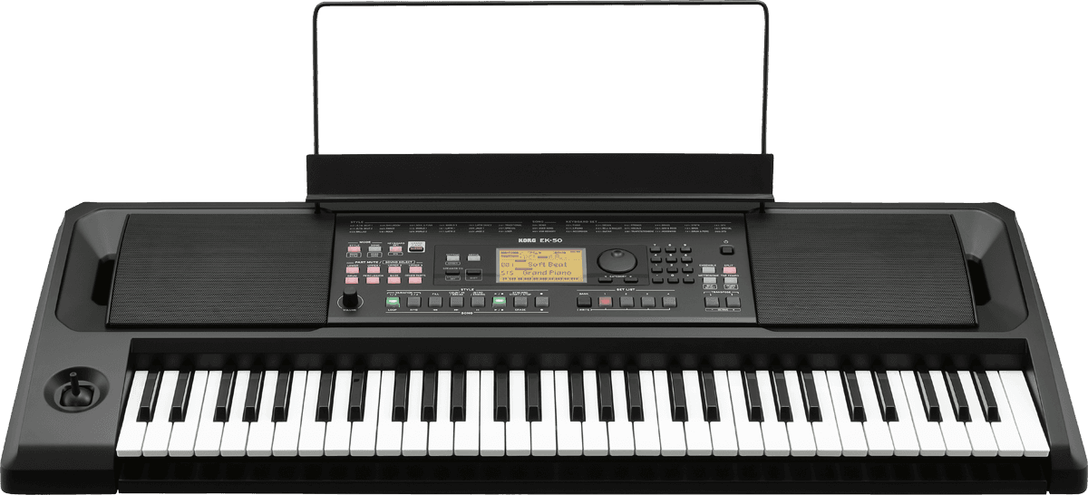 Le clavier qui vous aide à jouer Si vous avez déjà voulu jouer ou interpréter vos chansons préférées, ou si vous avez pensé à une mélodie qui pourrait devenir une chanson originale, KORG est là pour vous aider à réaliser votre potentiel musical. Le KORG EK-50 est un clavier arrangeur que vous pouvez apprécier quel que soit votre niveau musical, et un instrument qui grandit avec vous. La section "Styles" propose une bibliothèque complète de 280 accompagnements qui vous permettront de jouer n'importe quel style musical. Dès que vous commencez à jouer, de riches accompagnements sont créés pour vous inspirer à ajouter des mélodies au fur et à mesure qu'elles viennent à l'esprit. Au fur et à mesure que vous gagnez en performance, vous pouvez facilement accéder aux fonctions les plus avancées pour donner forme à vos interprétations musicales. - Des styles qui soutiennent votre performance - Jouez une grande variété de sonorités - Une interface intuitive et simple à maitriser - Haut-parleurs intégrés pour un plaisir immédiat où que vous soyez - Styles de musique de qualités et universels - Jouez par-dessus vos chansons préférées. - Ajouter des styles de la vaste bibliothèque KORG Des styles qui soutiennent votre performance L'EK-50 est équipé d'une fonction d'accompagnement automatique appelée "Styles", qui vous permet de produire automatiquement un accompagnement riche avec un seul doigt de la main gauche ou en jouant des accords. Comme cet accompagnement change en fonction de la position du clavier ou de l'accord que vous jouez, vous pouvez facilement improviser en jouant la mélodie avec votre main droite. C'est comme diriger un groupe qui connaît des centaines de chansons d'une simple pression du doigt. Les styles intégrés au EK-50 couvrent plus de 280 genres musicaux du monde entier, chacun disposant de quatre variations allant de simples à complexes, ainsi qu'une intro et une fin pour le début et la fin de la chanson. Vous pouvez ajouter de la variété à votre performance en changeant ces boutons en fonction du rythme. Il y a aussi un "STS". (Single Touch Select) qui sélectionne automatiquement les sonorités lorsque vous changez de style. C’est une combinaison parfaite de sons et de styles, prêts à l'emploi, de sorte que vous pouvez vous concentrer sur l'apprentissage, la création ou la performance. Jouez une grande variété de sons L'EK-50 contient plus de 702 sons réalistes, dont des pianos, violons, saxophones et batteries. Vous choisissez et jouez le son dont vous avez besoin, que vous jouiez en solo ou dans un groupe. Vous pouvez également utiliser la fonction Split pour diviser le clavier et jouer simultanément différents sons - comme le piano avec la main droite et la basse avec la main gauche. Cela crée un plaisir supplémentaire avec différentes combinaisons de sons. Une interface intuitive et simple à maitriser Le panneau frontal regroupant les commandes est doté d'un écran clair et lumineux qui affiche le son et les noms de styles actuellement sélectionnés en gros caractères pour une meilleure visibilité. Les boutons principaux sont éclairés par leurs propres LEDs, ce qui vous aide à visualiser le réglage de chaque fonction. Il y a aussi un "bouton Grand Piano " qui vous ramène à tout moment au son de départ du piano à queue, quel que soit le son sélectionné. Haut-parleurs intégrés ; pour un plaisir immédiat De puissants haut-parleurs stéréo 10W x 10W sont intégrés à l'instrument. Ils peuvent reproduire non seulement le son de l'instrument lui-même, mais aussi le son d'un dispositif externe que vous connectez à la prise d'entrée. De plus, un pupitre et un adaptateur secteur sont inclus, de sorte que vous êtes prêt à sortir de la boîte. L'EK-50 fonctionne également avec des piles AA (vendues séparément), ce qui vous permet de jouer en déplacement ! Styles de musique pratiques pour une lecture instantanée et complète. L'EK-50 contient 64 "Styles de musique" qui prédéfinissent le style, le son et le tempo appropriés pour les chansons que vous connaissez bien. Le simple fait de sélectionner un style de musique et de jouer est un moyen facile d'improviser ou de créer des idées pour des chansons originales. Lancez les arrangements de vos chansons préférées pendant que vous jouez. Vous avez une super idée de nouvelle chanson ? Vous pouvez enregistrer vos performances sur l'EK-50 et les sauvegarder. Le mode Song vous permet de lire vos propres créations originales, des démos internes, des données audio MP3 ou WAV et des données SMF (Standard MIDI File) enregistrées sur n'importe quel lecteur flash USB disponible dans le commerce. Vous pourrez également jouer des sons pendant la lecture de ces chansons. Ajouter des styles de la vaste bibliothèque de KORG L'EK-50 est ouvert, ce qui vous permet d'ajouter jusqu'à 98 styles via une clé USB. Nous prévoyons d'ajouter de nouvelles données sur le site Web de KORG à l'avenir et nous vous tiendrons informés. Spécifications Clavier : 61 touches (sensibles à la vélocité) Contrôle tactile : Doux (léger), moyen (standard), dur (plus lourd), fixe. Générateur de son : Générateur de son stéréo PCM Polyphonie maximale : 64 voix Sons : Plus de 702 sons, 41 kits de batterie (y compris les kits de sons compatibles GM). Configuration musicale : Plus de 170 sets Effets : Partie accompagnement : 2 multi-effets numériques stéréo numériques multi-effets Partie clavier : 2 multi-effets numériques stéréo numériques multi-effets 34 types (148 variations) Styles : Plus de 280 préréglages 2 intros, 4 variations, 2 fill-ins, 1 décompte /break, 2 fins, synchro start/stop, tap tempo Styles de musique : 64 styles Chansons de démonstration : 18 chansons Lecteur audio : MP3, WAV (44,1 kHz) Séquenceur : Enregistrer : Enregistrement en temps réel (mode Style), maximum de 999 chansons (environ 100 000 notes), 12 pistes (4 par