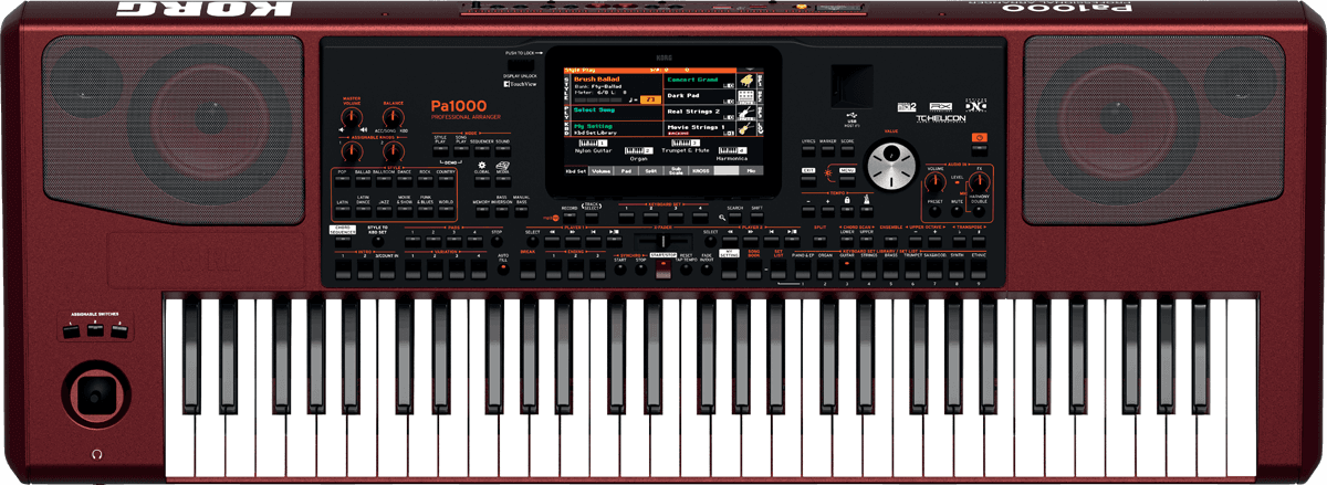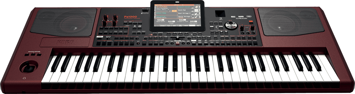 Ce nouveau clavier se voit doté de nombreuses fonctionnalités qui le placent bien en évidence dans la cour des (très) grands. Tout d’abord, parlons du moteur sonore. Celui du Pa1000 bénéficie de quatre fois plus de mémoire PCM que le Pa900 et étend donc la quantité de mémoire PCM utilisateur à 600 Mo en utilisant la compression. Cela se traduit par des instruments avec plus de dynamique et donc une plus grande qualité de vos performances. Le nombre d'emplacements de style utilisateur a également été étendu à un maximum de 1 152 qui couvrira presque tous les styles imaginables (eux aussi ayant été revus). A côté de cela, le système de haut-parleurs intégré a été amélioré pour produire un son encore plus puissant et dynamique via des fonctions standards telles que l'harmoniseur vocal TC Helicon, un lecteur et enregistreur MP3 double et le double séquenceur Crossfade. A noter : la sortie vidéo est normalisée, afin que votre public puisse chanter les paroles s’affichant à l'écran. Le Pa1000 intègre tout ceci dans une coque de haute qualité avec des inserts en aluminium surplombant un châssis élégant pour offrir un look ravageur sur n'importe quelle scène ! De nombreuses autres améliorations sur la fiche détaillée en français sur le site du constructeur : l'arrangeur Pa1000 Nouvelle vidéo manuel KORG Pa1000 Sur Youtube ici : Spécifications : Clavier de 61 touches semi-lestées (C2-C7) sensibles à la vélocité, avec aftertouch Générateur sonore EDS-X Filtres avec résonance et égaliseur de trois bandes pour chaque son 128 oscillateurs/voix de polyphonie 2 effets d’insert et deux Master, 148 types d’effets au total pour les Songs, 1 effet d’insert et deux master pour les sons, limiteur et égaliseur global Processeur vocal TC-Helicon avec égaliseur, compresseur, gate, harmoniseur/doubleur de trois voix, deux effets Plus de 30 presets d’effets et 64 utilisateur Processeur pour guitare avec trois effets, 45 presets d’usine et 64 utilisateur Plus de 1 750 sons d’usine, dont deux piano stéréo multicouche avec résonance et sourdine, jeux de sons GM/XG et 107 kits rythmiques 512 son et 256 kits rythmiques utilisateur Tirettes harmoniques, percussion, key on/off, repisse et effet d’enceinte rotative Mémoire de samples PCM compatible avec les formats Korg, WAV, AIFF et SoundFont et fonctions d’édition, de slicing et d’échantillonnage Plus de 430 Style d’usine reconfigurables, 1 152 emplacements utilisateur 8 pistes d’accompagnement, 4 sets de claiver, 4 pads par style et paramètres de sons et d’arrangeur par style ; Convertisseur MIDI Song vers Style Séquenceur d’accords avec fonctions d’import/export au format SMF Mémoire pour paramètres de sons avec plus de 300 Sets configurables et 864 emplacements utilisateur Kaoss FX avec plus de 65 presets d’usine XDS Crossfade Dual Sequencer Player breveté, deux lecteurs avec transport séparé, contrôle X-Fader, édition, bouclage, marqueurs, fonction jukebox, support de formats Mid, Kar, MP3+paroles, MP3+G, Lecteur et enregistreur MP3 avec transposition entre -5 et +6 demi-tons et modification du tempo sur ± 30 % et suppresseur vocal Séquenceur de 16 pistes, fonction par pas, jusqu’à 200 000 évènements, format SMF natif Base de données musicale (Songbook) programmable compatible MID, Kar et MP3 4 pads assignables avec fonction d’enregistrement Différentes options de transposition Gamme arabe incluse Entrée pour pédale de sourdine avec support du half-pedaling Entrées ligne droite et gauche sur jacks 6,35 mm Entrée micro/guitare (gauche) sur jack 6,35 mm avec jusqu’à +40 dB de gain Sorties audio droite et gauche sur jacks 6,35 mm Sortie casque sur jack 6,35 mm 2 woofers de 100 mm en configuration Bass Reflex et deux tweeters à dôme de 25 mm, puissance de 2 x 33 W Entrée et sortie MIDI Ports USB 2.0 de type A to Host à l’avant et à l’arrière, et de type B to Device à l’arrière Mémoire interne de 960 MB Port pour carte microSD à l’arrière Écran couleur TFT TouchView de 7” inclinable Sortie vidéo sur RCA Dimensions : 1 030 x 378,3 x 133 mm Poids : 10,75 kg