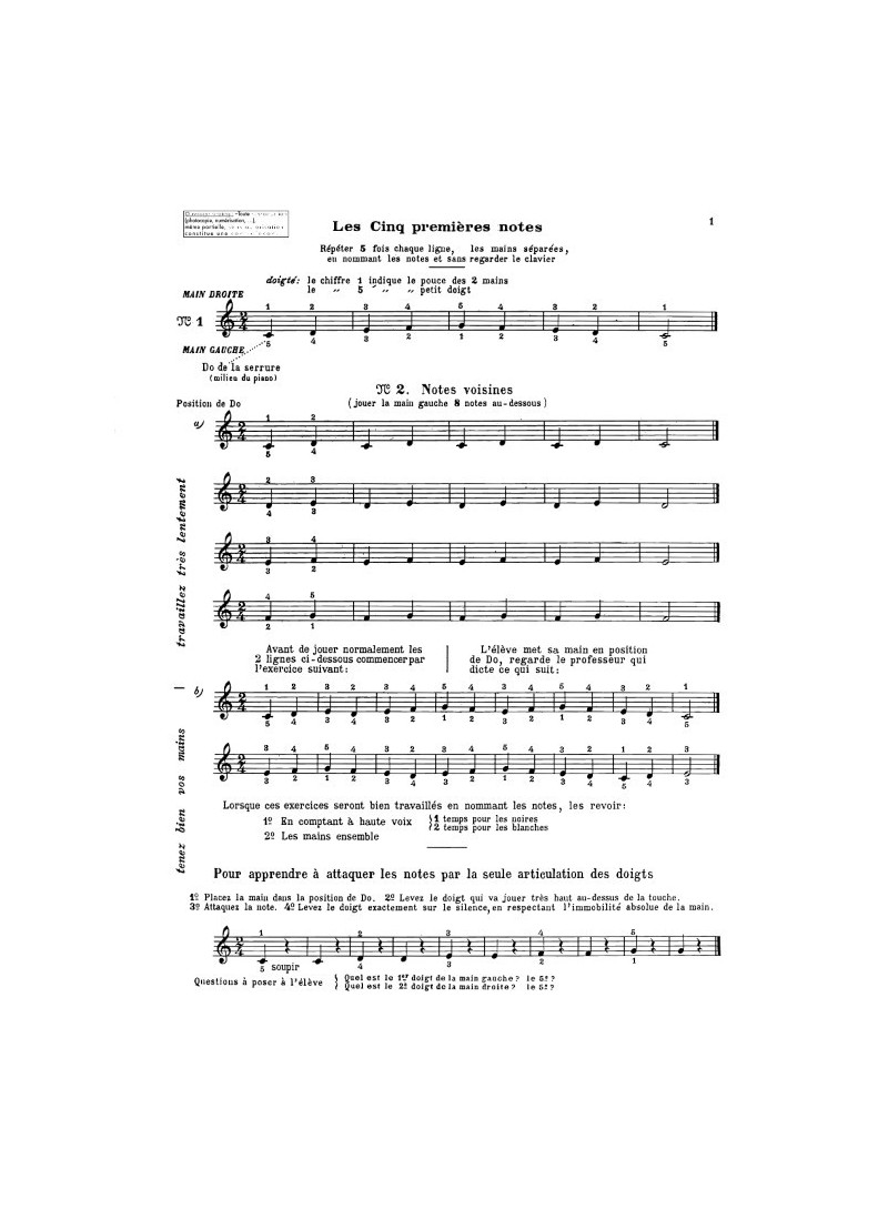 Cette méthode "à l'ancienne" commence par des exercices pour préparer les mains à se positionner correctement sur le clavier.