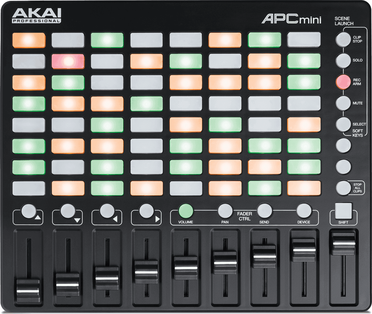 - Contrôleur ultraportable dédié pour Ableton Live - Intégration transparente et liaison directe avec Ableton Live - Matrice de 8 x 8 pads pour le déclenchement des clips avec indication de leur statut - 8 faders de voie, 1 fader master assignable à diverses fonctions - Alimenté par USB, configuration plug & play pour une portabilité maximale - Livré avec Ableton Live Lite, Hybrid 3 de Air Music Tech et 5 packs de samples Toolroom Artist en téléchargement - Poids et dimensions : 0,69 kg - 239 x 201 x 25 mm l'APC mini est le plus compact des contrôleurs pour Ableton LIVE tout en conservant la qualité de fabrication Akai Pro. Conçu pour le musicien ou le producteur mobile, l'APC mini intègre un concentré des fonctions essentielles provenant de l'APC40MKII : une matrice de 8 x 8 boutons multicouleurs pour le déclenchement des clips, une série de switchs et les 8 faders de canaux. Également auto-alimenté par le bus USB, l'APC mini permet un contrôle inégalé pour une si petite surface et sera livré avec une suite de logiciels comprenant Ableton Live Lite, Hybrid 3.0 d’Air Music, et plusieurs packs d’échantillons en provenance directe d’artistes DJ du label Toolroom Records.