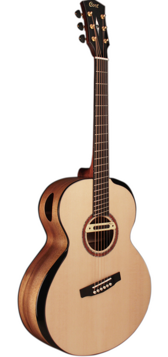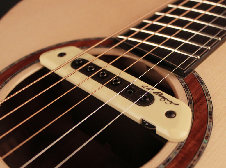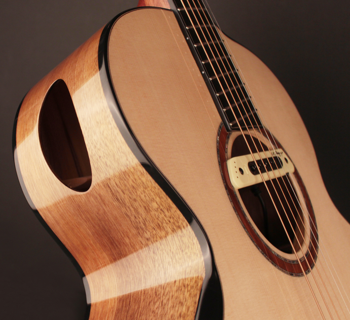 CUT CRAFT, série limitée, forme Small Jumbo, table épicéa européen, fond & éclisses myrtlewood, micro LR Baggs M80, étui