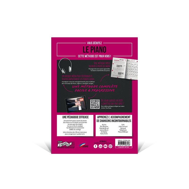 Facile, complète et progressive, cette méthode est idéale pour jouer des morceaux de Patrick Bruel, Aaron, James Blunt, Pascal Obispo, Coldplay, The Beatles...