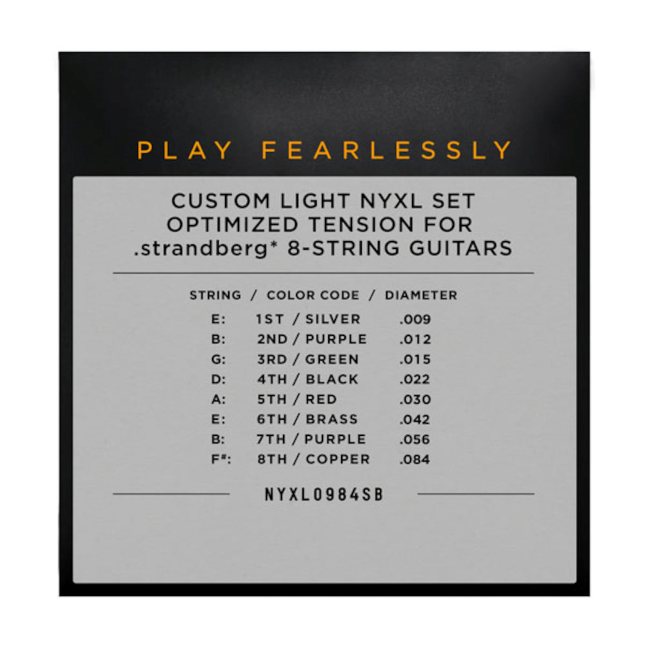 Le jeu NYXL0984 est optimisé pour les dimensions variables des guitares 8 cordes Strandberg* (67,3 à 71,1 cm / 26,5'' à 28') : acier pur .009, .012, .015, filet nickel .022, .030, .042, .056, .084