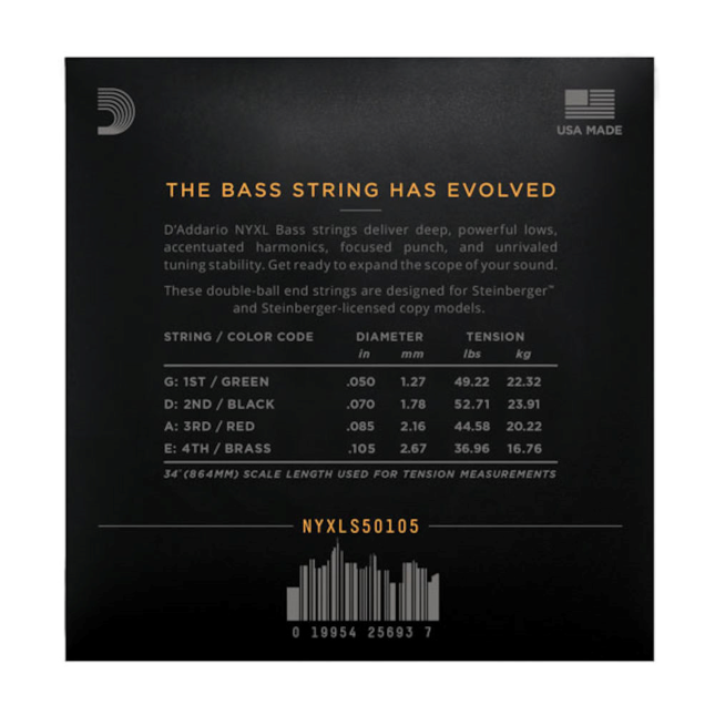 D'Addario Nickel pour basse D'Addario ESXL170, Light, 45-100, extrémités à boule, cordes longues