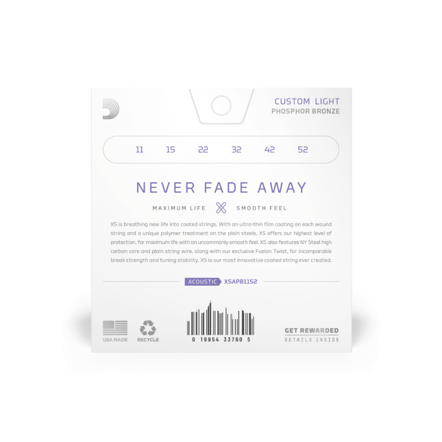 XS apporte un nouveau souffle aux cordes gainées. Avec son revêtement en film ultra fin sur chaque corde filée, ainsi que son traitement polymère unique sur les cordes aiguës, cette nouvelle gamme offre notre plus haut niveau de protection pour une durée de vie maximale avec un toucher exceptionnellement doux. XS intègre également notre âme en acier « NY Steel » à haute teneur en carbone, ainsi que notre procédé d’enroulement exclusif « Fusion Twist », pour une résistance à la casse et une stabilité d’accordage incomparables. Disponibles en bronze phosphoreux pour les guitares acoustiques 6 et 12 cordes, dans une variété de tirants allant de l’Extra-Light au Medium.