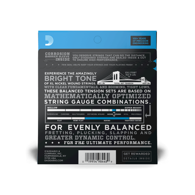 Les XL filées au nickel, cordes pour guitare électrique les plus populaires de D'Addario, sont faites d'un fil d'acier plaqué nickel filé avec précision autour d'une âme en acier carboné soigneusement usinée. Le résultat : des cordes durables à la tonalité brillante distinctive, à l'intonation excellente, idéales pour un large éventail de guitares et de styles musicaux. Le jeu D'Addario EXL170BT à tension équilibrée pour guitare électrique est constitué de combinaisons de calibres optimisées mathématiquement pour un meilleur contrôle et un confort de jeu amélioré. Associé au son brillant significatif de la gamme XL avec filet nickel, chaque jeu offre un meilleur contrôle dynamique et un toucher plus régulier entre les cordes afin d'équilibrer le jeu (bends, jeu gratté, tapping, jeu pincé, slap...).