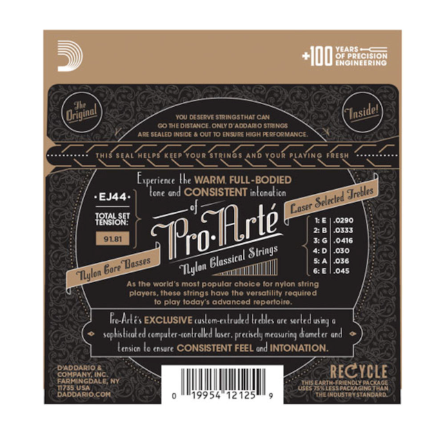 Le jeu EJ44 à tension extra-forte est idéal pour une résistance et projection maximales sans compromis sur le son.Les cordes Pro-Arte, cordes acoustiques les plus populaires au monde, sont les jeux pour guitare classique de première qualité proposés par D'Addario. Toutes les cordes aiguës Pro-Arte sont triées par une machine laser à commande numérique qui effectue des centaines de mesures de diamètre/tension et de vérifications de qualité, afin de garantir un son authentique et des aigus précis pour chaque jeu. Les cordes basses Pro-arte sont filetées avec un brin en cuivre plaqué argent sur un coeur multi-filaments en nylon, ce qui permet d'obtenir un son chaud et équilibré avec une excellente projection.