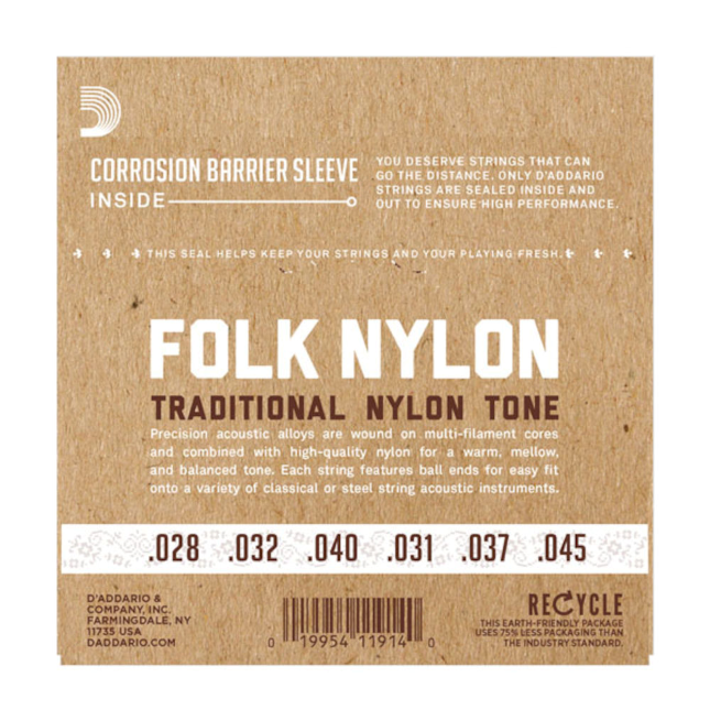 Les cordes en nylon D'Addario Folk sont fabriquées en nylon de qualité supérieure avec une extrémité à boule pour permettre un montage facile sur les guitares classiques ou folk.