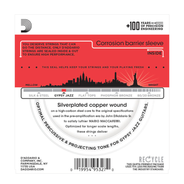 Le brin en cuivre plaqué argent est fileté sur un cœur en acier à forte teneur en carbone afin d'obtenir un son chaud et une projection optimale pour le jazz manouche.