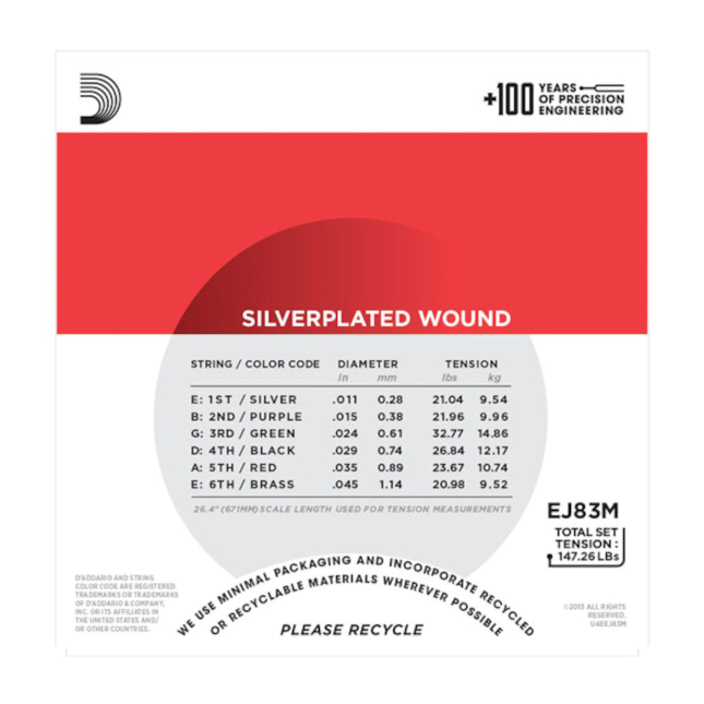 Calibre : Acier pur .011, .015, Filet en cuivre plaqué argent .024, .029, .035, .045