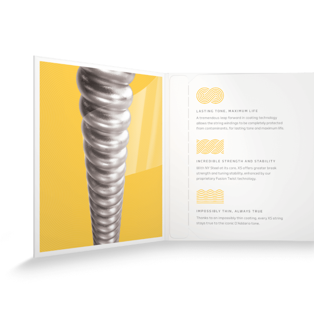 XS apporte un nouveau souffle aux cordes gainées. Constituée de cordes filées recouvertes d’un revêtement ultrafin, et de cordes non-filées bénéficiant d'un traitement polymère unique, la gamme XS vous fait profiter de notre niveau de protection le plus élevé pour des cordes avec une durée de vie maximale et un toucher doux surprenant. Les cordes XS sont constituées d’une âme en acier NY Steel à haute teneur en carbone, et tirent parti de notre processus exclusif « Fusion Twist » pour une stabilité d'accordage et une résistance à la casse incomparables. XS est la corde à revêtement la plus innovante jamais créée.