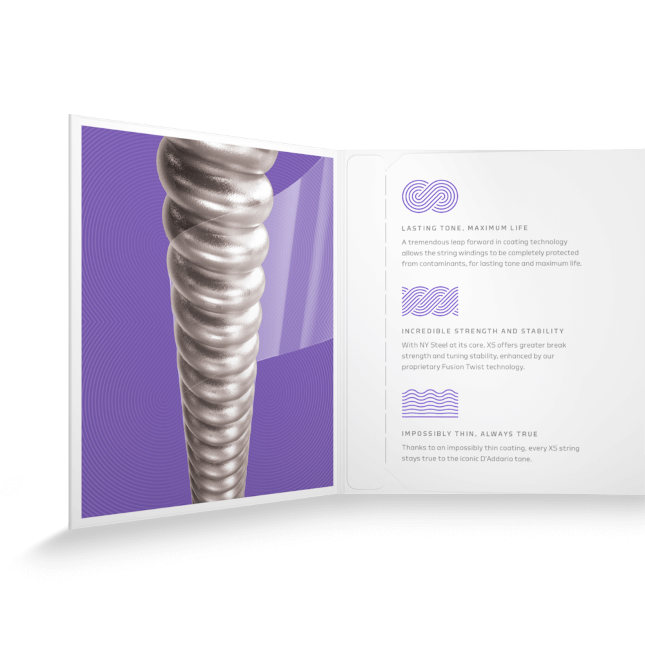 XS apporte un nouveau souffle aux cordes gainées. Constituée de cordes filées recouvertes d’un revêtement ultrafin, et de cordes non-filées bénéficiant d'un traitement polymère unique, la gamme XS vous fait profiter de notre niveau de protection le plus élevé pour des cordes avec une durée de vie maximale et un toucher doux surprenant. Les cordes XS sont constituées d’une âme en acier NY Steel à haute teneur en carbone, et tirent parti de notre processus exclusif « Fusion Twist » pour une stabilité d'accordage et une résistance à la casse incomparables. XS est la corde à revêtement la plus innovante jamais créée.