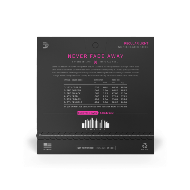 Caractéristiques cordes XT pour basse en acier plaqué nickel, Regular Light, 6 cordes , 32-130