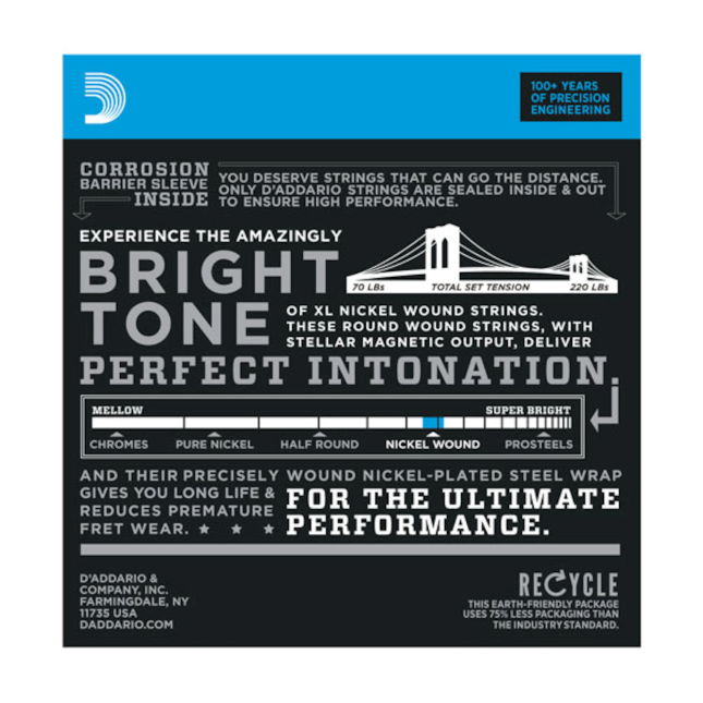 Les cordes pour guitare électrique avec filet nickel D'Addario XL sont les plus populaires de la marque. Elles sont filées avec précision en acier plaqué nickel sur une âme hexagonale en acier à haute teneur en carbone usinée avec soin. Le résultat : des cordes durables aux sonorités brillantes distinctes et à l'intonation excellente, qui sont idéales pour un vaste éventail de guitares et de registres musicaux.