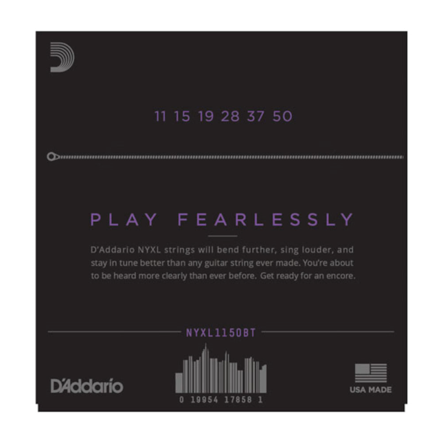 Les cordes NYXL1150BT bénéficient d'une tension équilibrée (Balanced) pour permettre de jouer des notes, des bends et des accords avec plus d'uniformité sur tout le manche : acier pur .011, .015, .019, filet nickel .028, .037, .050