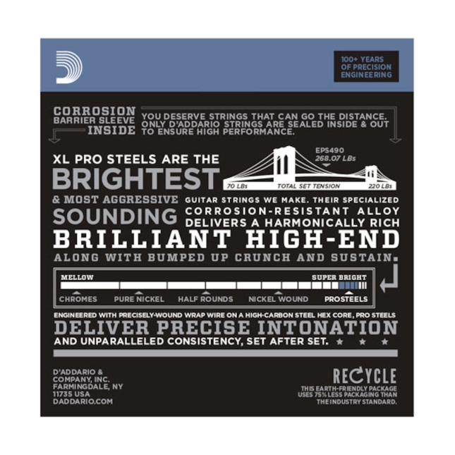 Les cordes D'Addario XL ProSteels sont fabriquées avec un alliage en acier hautement magnétique et résistant à la corrosion pour produire des sonorités ultra-brillantes sans harmoniques indésirables.