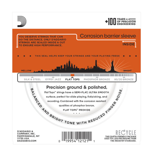 Les cordes D'Addario Flat Tops sont fabriquées avec un filet rond, puis limées avec précision pour conserver une surface extérieure lisse et « semi-plate ». Cela permet d'obtenir une surface de jeu lisse et aplatie sans sacrifier le son et le sustain superbes associés aux cordes en bronze phosphoreux. Les cordes Flat Tops réduisent de façon significative le bruit généré par les doigts et constituent donc un excellent choix pour les enregistrements ou le jeu au médiator.