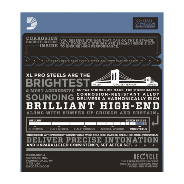 Les cordes D'Addario XL ProSteels sont fabriquées avec un alliage en acier hautement magnétique et résistant à la corrosion pour produire des sonorités ultra-brillantes sans harmoniques indésirables.