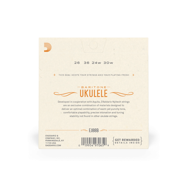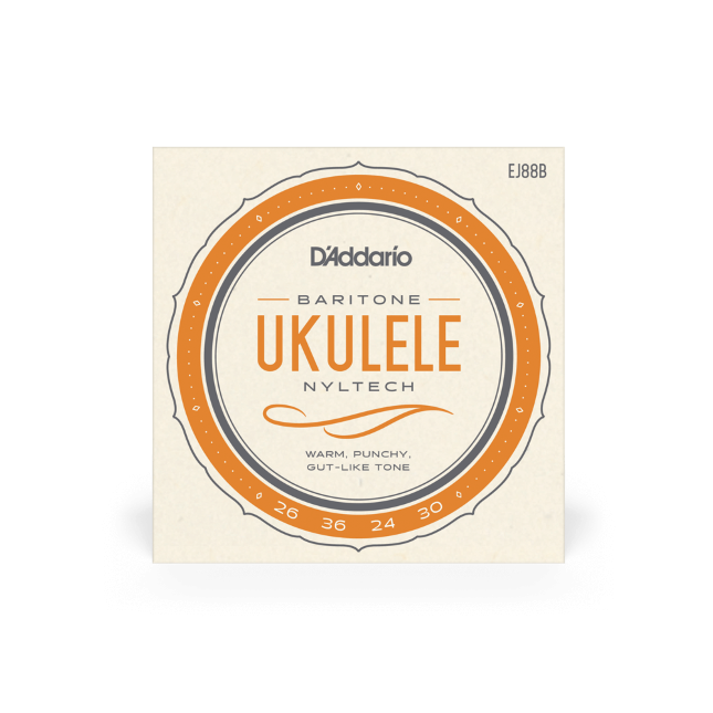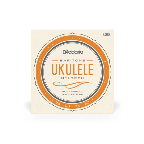 Les cordes D'Addario EJ88B sont spécifiquement conçues pour le ukulele bariton. La troisième et la quatrième corde sont faites d'un filet en cuivre plaqué argent sur coeur en nylon. La première et seconde corde sont fabriquées avec notre matériau Nyltech exclusif. Ce jeu est optimisé pour l'accordage standard Ré-Sol-Si-Mi (DGBE).Développées en collaboration avec Aquila, les cordes D'Addario Nyltech sont une association exclusive de matériaux conçus pour délivrer un équilibre optimal de chaleur, d'énergie, de confort de jeu, de précision dans l'intonation et de stabilité d'accordage, équilibre introuvable avec d'autres cordes pour ukulele.