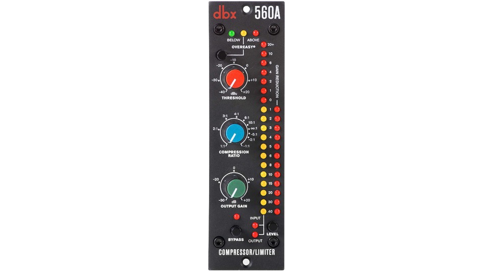 Le compresseur/limiteur dbx 560A permet à l’utilisateur de module au format rack 500 d’accéder au célèbre traitement de compression à base de VCA propre à dbx. Il dispose des populaires fonctions de compression OverEasy® et Hard Knee qui ont fait le succès du compresseur dbx 160A. Avec un seuil d’une très large amplitude, des contrôles de rapport de compression et de niveau de sortie associés à une véritable détection de niveau RMS, le 560A est l’un des compresseurs qui procure le son le plus naturel. Idéal pour la batterie, la voix ou la basse, il s’adapte à tout type de signal, de la plus subtile compression à la limitation de niveau la plus extrême. Son indicateur LEDs 19 segments affiche le niveau d’entrée ou de sortie, complété par un autre de 12 segments pour la réduction de gain. Son unique combinaison de réduction infinie avec son mode de compression inverse (qui réduit le niveau en-dessous du gain unitaire quand l’entrée dépasse le seuil) est une solution magique pour corriger toute exagération de niveau.