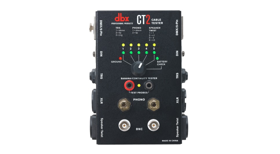 Le CT2 permet d'évaluer facilement le bon état d'une large variété de câbles. Il dispose des connecteurs les plus répandus : Speakon, XLR, Phono Cinch, BNC, DIN, jack stéréo, jack mono, DMX et Banane. Il fonctionne également pour des câbles utilisant des connecteurs différents à chaque extrimité. A l'aide d'indicateurs LEDs et d'un simple bouton rotatif, l'utilisateur peut facilement savoir si le câble est assemblé et fonctionne correctement ou s'il est défectueux.