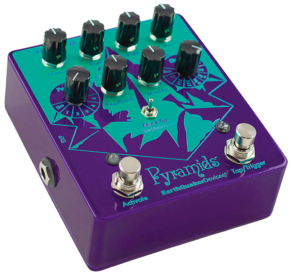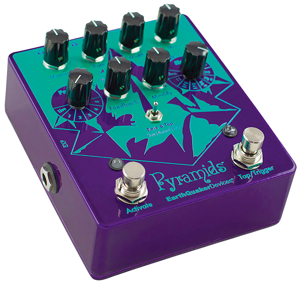 Conçue selon la même architecture DSP propriétaire que la célèbre Avalanche Run, la Pyramids est un flanger stéréo avec 5 presets (une première pour Earthquaker Devices), 8 modes de flanger (Classic, Through-Zero, Barber Pole Up, Barber Pole Down, Trigger Up, Trigger Down, Step, Random), tap tempo avec sous-divisions via le bouton Rate et le sélecteur Tap, un réglage Modify multi-fonction, feedback positif et négatif, un réglage Mix qu'on ne voit pas tous les jours sur un flanger.
